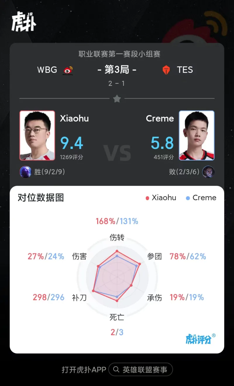 虎扑01月27日讯 Xiaohu瑞兹打出9/2/9战绩,拿到WBG对阵TES第三局比赛MVP